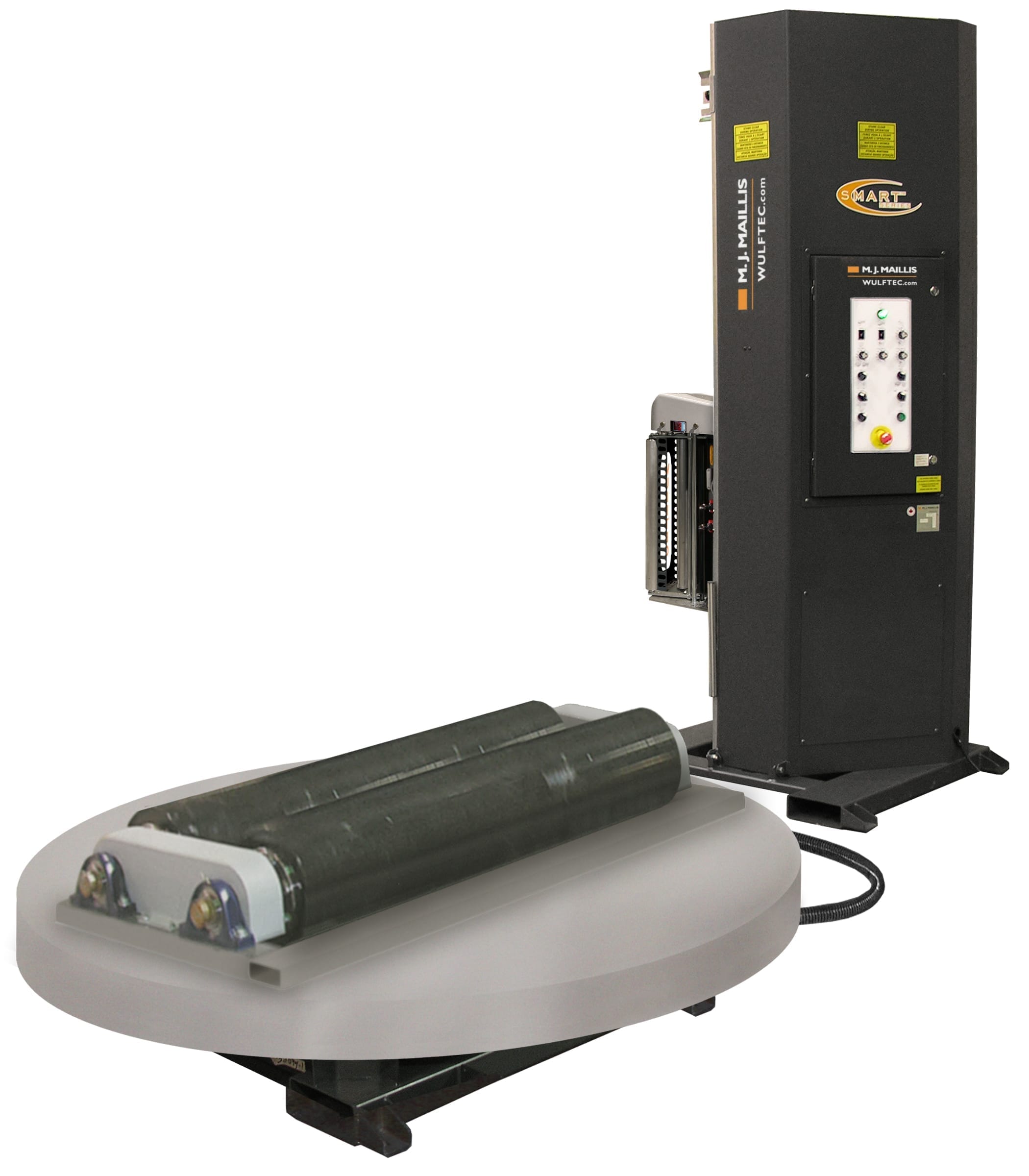 Key Specs: Production Rate 30 loads per hour Machine Dimensions 132 ” L x 59.5 ” W x 96.25 ” H Minimum Load Size 12 ” L x 24 ” W x 24 ” H Load Weight 4000 lbs Approximate Shipping Weight 2600 lbs Electrical Requirements 230 V / 3 ph / 60 Hz 15 A Pneumatic Requirements Not required, except with optional kicker Controls Allen Bradley MicroLogix 1200 PLC 24V control system Current overload protection NEMA 4/12 control cabinet Wrap selectors (1 to 99) Power On/Off switch and status light Start/Stop push button Large emergency stop (push / pull type) Manual carriage up/down function Variable table speed (16 RPM) with automatic home position with automatic home position Variable cradle roller speed Manual table job Cradle rotation jog Film tension adjustment Lack of film alarm Structure 14 gauge formed steel tower Forklift Portable base design from both ends Heavy duty structural steel construction Film Delivery System 20″ NO-THREAD® Powered Pre-Stretch Carriage 1 HP AC motor with Allen Bradley variable frequency drive Lifetime warranty on pre-stretch rollers blue compound Film force release for easy pull at start and end of cycle 50-400% pre-stretch ratio (preset to customer spec, Std 200%) Electronic film tension control with analog sensor Film roping bar Lexan roller cover for operator safety Proximity sensor on carriage gate to ensure gate is properly closed Film Carriage Drive 1 HP AC motor with Allen Bradley variable frequency drive Two #50 carriage lifting chains enclosed in tower for safety Bearing supported maintenance free guide wheels Turntable 77″ dia. x 1/2″ thick round table 60″ long powered cradle rollers Turntable Drive 1 HP AC motor with Allen Bradley variable frequency drive 0-16 RPM variable speed 25″ Heavy duty Ring gear bearing drive Electronic soft start/stop Positive turntable alignment controlled by proximity sensor Technical Information The machine is provided with a manual including electro/mechanical schematics and drawings, troubleshooting guide & Installation instructions