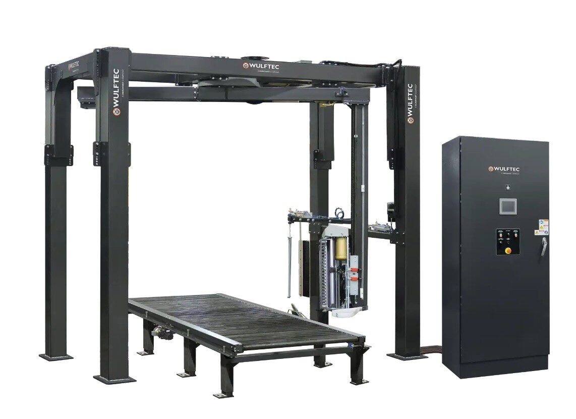 Key Specs: Production Rate 50 loads per hour Machine Dimensions 141.5 ” L x 130 ” W x 117.5 ” H Maximum Load Size 56 ” L x 56 ” W x 80 ” H Maximum Load Weight Unlimited Approximate Shipping Weight 2800 lbs Electrical Requirements 120 V / 1 ph / 60 Hz 15 A Air Requirements 3 cfm @ 80 psi Controls Allen Bradley MicroLogix 1200 PLC 24V control system Current overload protection NEMA 4/12 control cabinet (can be located up to 10′ from machine frame) Autoheight sensing photoeye Power on/off switch and status light Start/stop push button Large emergency stop (push / pull type) Manual carriage up/down function Variable rotary arm speed (12RPM) Separate up and down carriage speeds Separate top and bottom wrap selectors Reinforced wrap/manual rotation control Positive arm alignment controlled by proximity sensor Top cover pause switch (Splash proof program) Spiral up or spiral up/down switch Film force to load control Emergency stop sensor for arm path obstruction Mode switch (Manual or Automatic) Pull cord with 40′ of cable (to be installed by customer) Separate station on front of tower with clamp jog and an additional e-stop Lack of film alarm Structure Heavy duty structural steel construction Free standing integrated leg design Four (4) 6″ x 6″ floor mounting legs Easy access to all components Anchoring Requirements Wulftec recommends using heavy-duty expansion shields of 3/4″ diameter thread size with a minimum anchor depth of 4″ in concrete Film Delivery System 20″ NO-THREAD® Powered Pre-Stretch Carriage 1 HP AC motor with Allen Bradley variable frequency drive Lifetime warranty on pre-stretch rollers blue compound Film force release for easy pull at start and end of cycle 50-400% pre-stretch ratio (preset to customer spec, Std 200%) Electronic film tension control with analog sensor Lexan roller cover for operator safety Angled carriage to wrap approximately 2″ from floor level Proximity sensor on carriage gate to ensure gate is properly closed Film Carriage Drive 1 HP AC motor with Allen Bradley variable frequency drive Two #50 carriage lifting chains Dual 1/2″ CRS ways with UHMW-PE carriage glides Dual structural steel supporting boom Power track for efficient guiding of wires Film Tail Treatment Automated Cut/Clamp & Wipe system Pulse controlled cutter Film alignment arm & Brush on film tail treatment Rotary Arm Drive Heavy duty 25″ ring gear with pinion gear drive 1 HP AC motor with Allen Bradley variable frequency drive 0-12 RPM variable speed Electronic soft start/stop Positive arm alignment controlled by proximity sensor Protection guard over the ring gear Technical Information The machine is provided with a manual including electro/mechanical schematics and drawings, troubleshooting guide & Installation instructions
