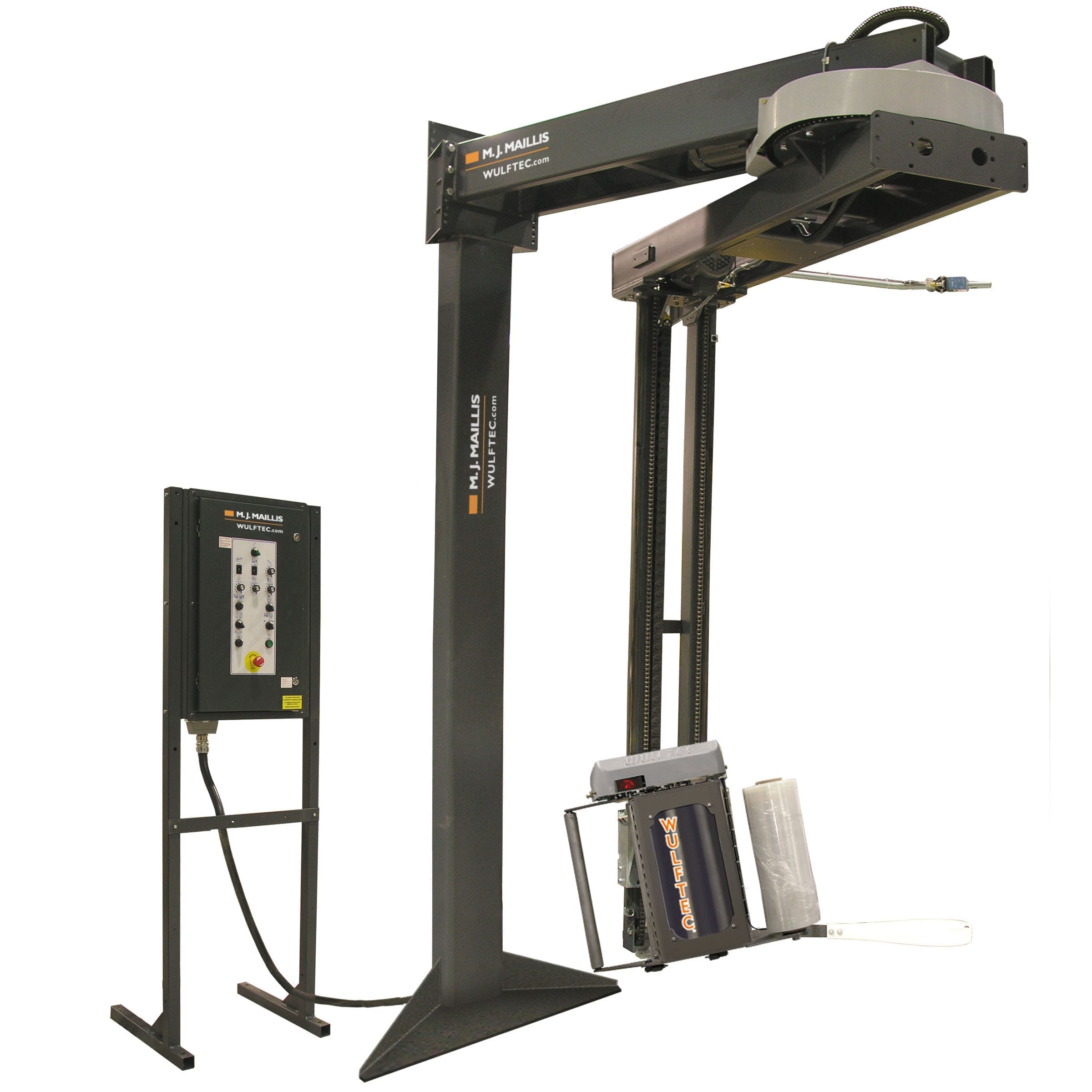 Key Specs: Production Rate 50 loads per hour Machine Dimensions 135.5 ” L x 130 ” W x 120 ” H Maximum Load Size 56 ” L x 56 ” W x 80 ” H Load Weight Unlimited Approximate Shipping Weight 1850 lbs Electrical Requirements 120 V / 1 ph / 60 Hz 15 A Controls Allen Bradley MicroLogix 1200 PLC 24V control system Current overload protection NEMA 4/12 control cabinet (can be located up to 10′ from machine frame) Autoheight sensing photoeye Power on/off switch and status light Start/stop push button Large emergency stop (push / pull type) Manual carriage up/down function Variable rotary arm speed (12RPM) Separate up and down carriage speeds Separate top and bottom wrap selectors Reinforced wrap/manual rotation control Positive arm alignment controlled by proximity sensor Top cover pause switch (Splash proof program) Spiral up or spiral up/down switch Film force to load control Emergency stop sensor for arm path obstruction Structure Heavy duty structural steel construction Column mounting design Floor and top frame mounting Easy access to all components Anchoring Requirements Wulftec recommends using heavy-duty expansion shields of 3/4″ diameter thread size with a minimum anchor depth of 4″ in concrete To be I-beam (6″ to 8″) mounted, there are 2 anchors at the bottom and also 2 bolts on the top of the machine frame Film Delivery System 20″ NO-THREAD® Powered Pre-Stretch Carriage 1 HP AC motor with Allen Bradley variable frequency drive Lifetime warranty on pre-stretch rollers blue compound Film force release for easy pull at start and end of cycle 50-400% pre-stretch ratio (preset to customer spec, Std 200%) Electronic film tension control with analog sensor Lexan roller cover for operator safety Angled carriage to wrap approximately 2″ from floor level Proximity sensor on carriage gate to ensure gate is properly closed Film Carriage Drive 1 HP AC motor with Allen Bradley variable frequency drive Two #50 carriage lifting chains Dual 1/2″ CRS ways with UHMW-PE carriage glides Dual structural steel supporting boom Power track for efficient guiding of wires Rotary Arm Drive Heavy duty 25″ ring gear with pinion gear drive 1 HP AC motor with Allen Bradley variable frequency drive 0-12 RPM variable speed Electronic soft start/stop Positive arm alignment controlled by proximity sensor Protection guard over the ring gear Technical Information The machine is provided with a manual including electro/mechanical schematics and drawings, troubleshooting guide & Installation instructions