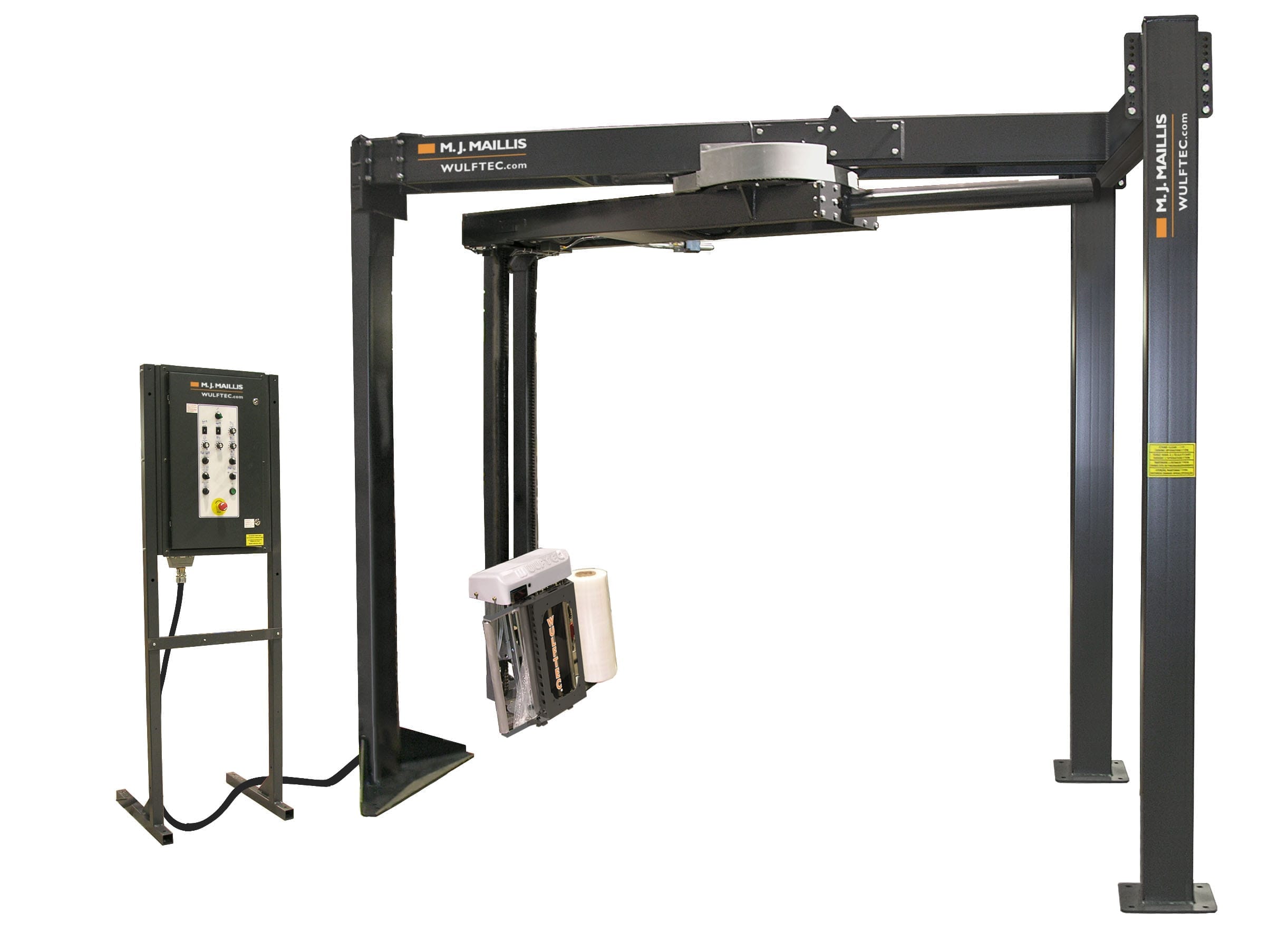 Key Specs: Production Rate 50 loads per hour Machine Dimensions 165.5 ” L x 130 ” W x 117.5 ” H Maximum Load Size 56 ” L x 56 ” W x 80 ” H Load Weight Unlimited Approximate Shipping Weight 2050 lbs Electrical Requirements 120 V / 1 ph / 60 Hz 15 A Controls Allen Bradley MicroLogix 1200 PLC 24V control system Current overload protection NEMA 4/12 control cabinet (can be located up to 10′ from machine frame) Autoheight sensing photoeye Power on/off switch and status light Start/stop push button Large emergency stop (push / pull type) Manual carriage up/down function Variable rotary arm speed (12RPM) Separate up and down carriage speeds Separate top and bottom wrap selectors Reinforced wrap/manual rotation control Positive arm alignment controlled by proximity sensor Top cover pause switch (Splash proof program) Spiral up or spiral up/down switch Film force to load control Emergency stop sensor for arm path obstruction Structure Heavy duty structural steel construction Free standing integrated leg design Floor mounting legs (3 legs) Easy access to all components Anchoring Requirements Wulftec recommends using heavy-duty expansion shields of 3/4″ diameter thread size with a minimum anchor depth of 4″ in concrete. To be I-beam (6″ to 8″) mounted, there are 2 anchors at the bottom and also 2 bolts on the top of the machine frame. Film Delivery System 20″ NO-THREAD® Powered Pre-Stretch Carriage 1 HP AC motor with Allen Bradley variable frequency drive Lifetime warranty on pre-stretch rollers blue compound Film force release for easy pull at start and end of cycle 50-400% pre-stretch ratio (preset to customer spec, Std 200%) Electronic film tension control with analog sensor Lexan roller cover for operator safety Angled carriage to wrap approximately 2″ from floor level Proximity sensor on carriage gate to ensure gate is properly closed Film Carriage Drive 1 HP AC motor with Allen Bradley variable frequency drive Two #50 carriage lifting chains Dual 1/2″ CRS ways with UHMW-PE carriage glides Dual structural steel supporting boom Power track for efficient guiding of wires Rotary Arm Drive Heavy duty 25″ ring gear with pinion gear drive 1 HP AC motor with Allen Bradley variable frequency drive 0-12 RPM variable speed Electronic soft start/stop Positive arm alignment controlled by proximity sensor Protection guard over the ring gear Technical Information The machine is provided with a manual including electro/mechanical schematics and drawings, troubleshooting guide & Installation instructions