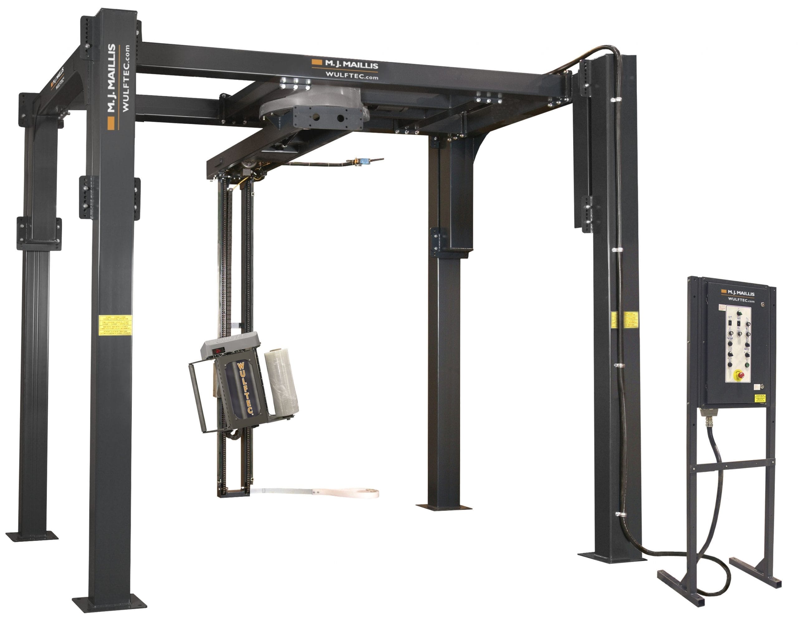 Key Specs: Production Rate 50 loads per hour Machine Dimensions 141.5 ” L x 130 ” W x 117.5 ” H Maximum Load Size 56 ” L x 56 ” W x 80 ” L x Load Weight Unlimited Approximate Shipping Weight 2050 lbs Electrical Requirements 120 V / 1 ph / 60 Hz 15 A Controls Allen Bradley MicroLogix 1200 PLC 24V control system Current overload protection NEMA 4/12 control cabinet (can be located up to 10′ from machine frame) Autoheight sensing photoeye Power on/off switch and status light Start/stop push button Large emergency stop (push / pull type) Manual carriage up/down function Variable rotary arm speed (12RPM) Separate up and down carriage speeds Separate top and bottom wrap selectors Reinforced wrap/manual rotation control Positive arm alignment controlled by proximity sensor Top cover pause switch (Splash proof program) Spiral up or spiral up/down switch Film force to load control Emergency stop sensor for arm path obstruction Structure Heavy duty structural steel construction Free standing integrated leg design Floor mounting legs (4 legs) Easy access to all components Anchoring Requirements Wulftec recommends using heavy-duty expansion shields of 3/4″ diameter thread size with a minimum anchor depth of 4″ in concrete. To be I-beam (6″ to 8″) mounted, there are 2 anchors at the bottom and also 2 bolts on the top of the machine frame. Film Delivery System 20″ NO-THREAD® Powered Pre-Stretch Carriage 1 HP AC motor with Allen Bradley variable frequency drive Lifetime warranty on pre-stretch rollers blue compound Film force release for easy pull at start and end of cycle 50-400% pre-stretch ratio (preset to customer spec, Std 200%) Electronic film tension control with analog sensor Lexan roller cover for operator safety Angled carriage to wrap approximately 2″ from floor level Proximity sensor on carriage gate to ensure gate is properly closed Film Carriage Drive 1 HP AC motor with Allen Bradley variable frequency drive Two #50 carriage lifting chains Dual 1/2″ CRS ways with UHMW-PE carriage glides Dual structural steel supporting boom Power track for efficient guiding of wires Rotary Arm Drive Heavy duty 25″ ring gear with pinion gear drive 1 HP AC motor with Allen Bradley variable frequency drive 0-12 RPM variable speed Electronic soft start/stop Positive arm alignment controlled by proximity sensor Protection guard over the ring gear Technical Information The machine is provided with a manual including electro/mechanical schematics and drawings, troubleshooting guide & Installation instructions
