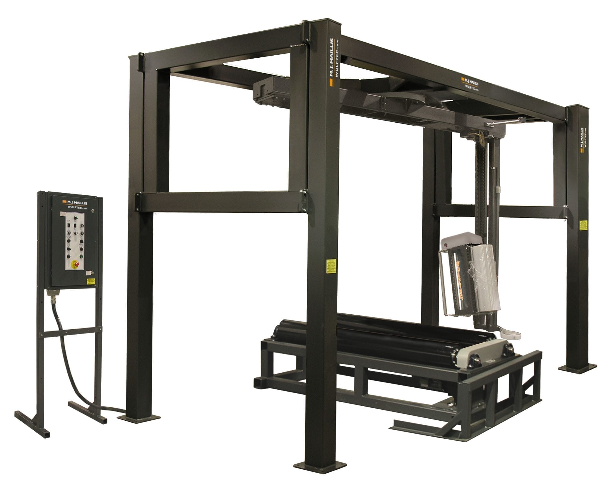 Key Specs: Key Specs Features Options Production Rate 50 loads per hour Machine Dimensions 141.5 ” L x 130 ” W x 117.5 ” H Minimum Load Size 12 ” L x 24 ” W x 24 ” H Maximum Load Size 52 ” L x 52 ” W x 52 ” H Load Weight 4000 lbs Approximate Shipping Weight 3300 lbs Electrical Requirements 120 V / 1 ph / 60 Hz 20 A Controls Allen Bradley MicroLogix 1200 PLC 24V control system Current overload protection NEMA 4/12 control cabinet (can be located up to 10′ from machine frame) Autoheight sensing photoeye Power on/off switch and status light Start/stop push button Large emergency stop (push / pull type) Manual carriage up/down function Variable rotary arm speed (12RPM) Separate up and down carriage speeds Separate top and bottom wrap selectors Reinforced wrap/manual rotation control Positive arm alignment controlled by proximity sensor Top cover pause switch (Splash proof program) Spiral up or spiral up/down switch Film force to load control Emergency stop sensor for arm path obstruction Structure Heavy duty structural steel construction Free standing integrated leg design Floor mounting legs (4 legs) Easy access to all components Anchoring Requirements Wulftec recommends using heavy-duty expansion shields of 3/4″ diameter thread size with a minimum anchor depth of 4″ in concrete. To be I-beam (6″ to 8″) mounted, there are 2 anchors at the bottom and also 2 bolts on the top of the machine frame Film Delivery System 20″ NO-THREAD® Powered Pre-Stretch Carriage 1 HP AC motor with Allen Bradley variable frequency drive Lifetime warranty on pre-stretch rollers blue compound Film force release for easy pull at start and end of cycle 50-400% pre-stretch ratio (preset to customer spec, Std 200%) Electronic film tension control with analog sensor Lexan roller cover for operator safety Angled carriage to wrap approximately 2″ from floor level Proximity sensor on carriage gate to ensure gate is properly closed Film Carriage Drive 1 HP AC motor with Allen Bradley variable frequency drive Two #50 carriage lifting chains Dual 1/2″ CRS ways with UHMW-PE carriage glides Dual structural steel supporting boom Power track for efficient guiding of wires Rotary Arm Drive Heavy duty 25″ ring gear with pinion gear drive 1 HP AC motor with Allen Bradley variable frequency drive 0-12 RPM variable speed Electronic soft start/stop Positive arm alignment controlled by proximity sensor Protection guard over the ring gear Cocoon Cradle 4,000 lbs capacity 6 5/8″ O.D tubing 1/4″ thick wall on tubing Frame made of 3/16″ thick wall tubin 1 HP AC motor Technical Information The machine is provided with a manual including electro/mechanical schematics and drawings, troubleshooting guide & Installation instructions